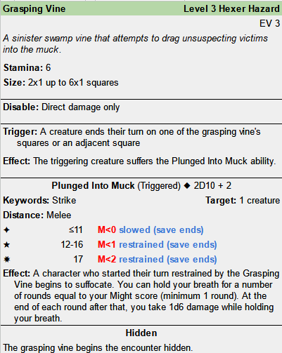 Lastly (and this has more to do with next session than the previous one), I made my first Draw Steel! homebrew! It’s a very simple environmental hazard (and honestly very similar to one that’s already in the monster packet they sent out) but it’s mine! It’s a hidden evil vine that’s going to try to drown the PCs in the swamp! How fun!